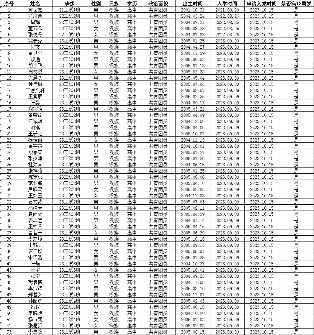 黄世嘉等53名同志已经向党组织提交了入党申请书。根据发展党员工作有关要求,现将其有关情况予以公示。在公示期限内,欢迎广大党内外群众来信(署名)、来电或来访反映问题。公示时间为2023年10月16日至2023年10月20日(5个工作日)。