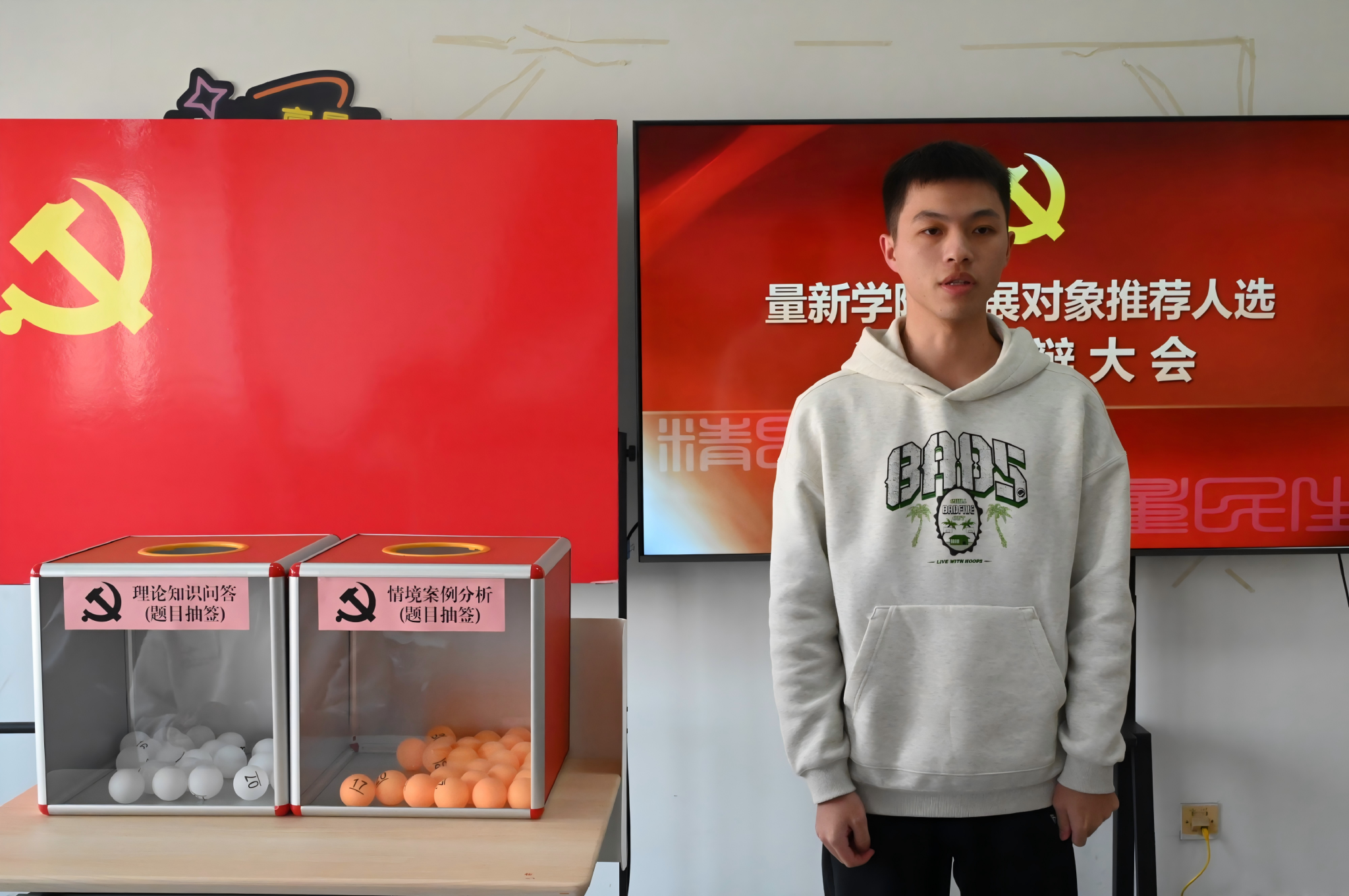 根据量新学院发展党员补充细则,经团组织推优产生的发展对象候选人,须参加由学院组织的入党公开答辩,包含入党动机陈述、理论知识问答、情境案例分析三个环节,由评议小组结合答辩情况以及支委会意见、党员群众意见、日常综合表现等确定发展对象人选。