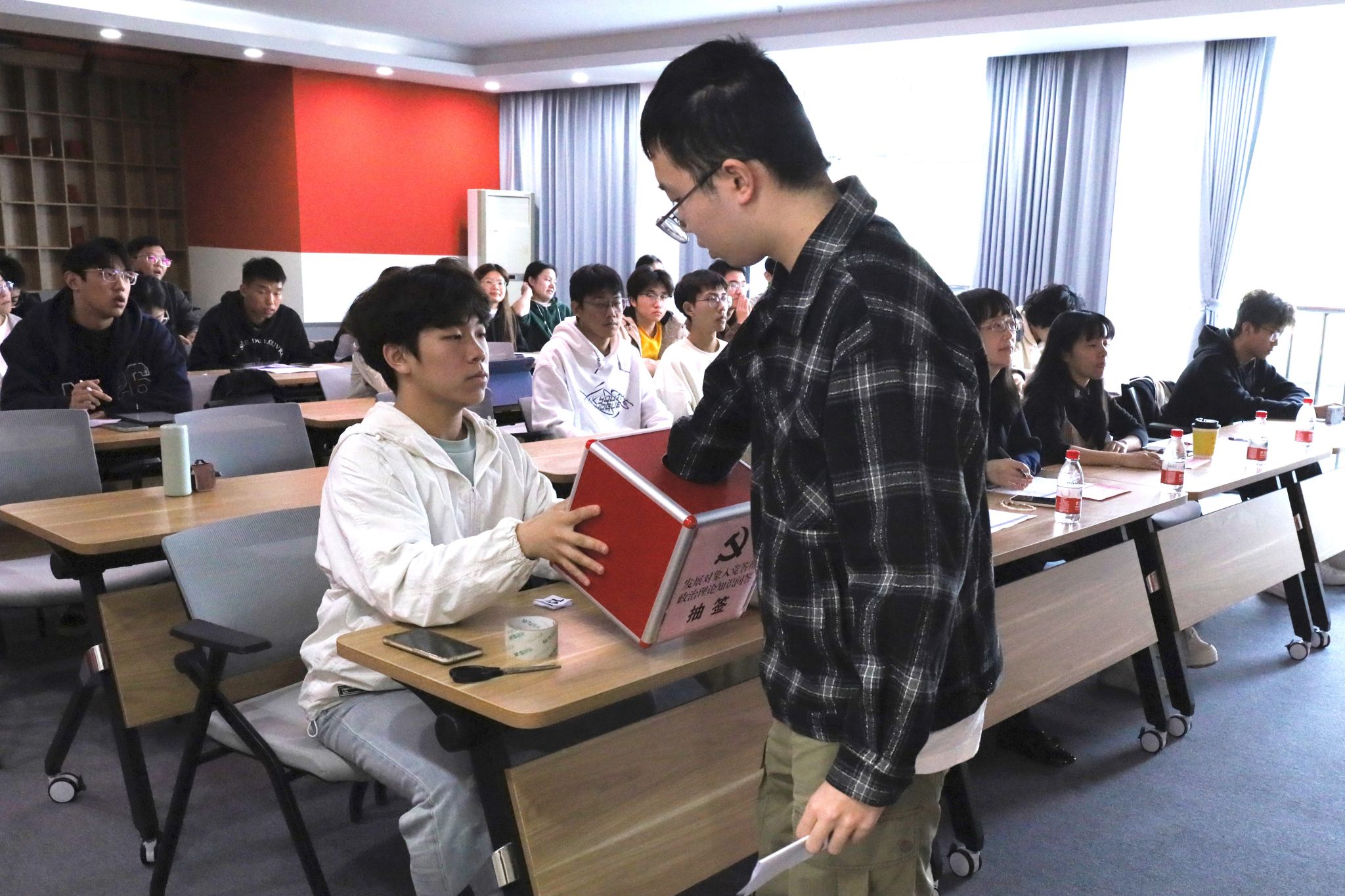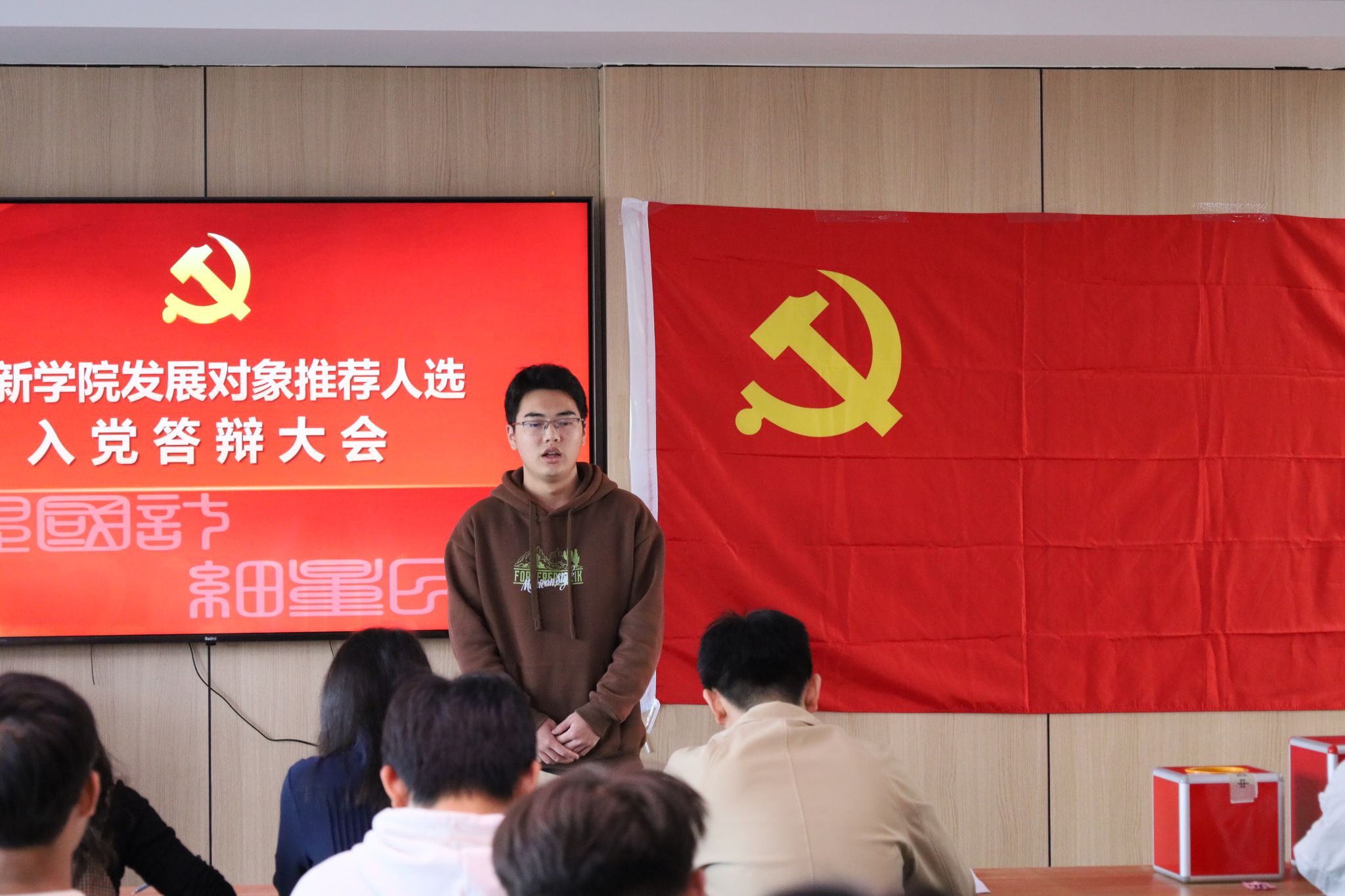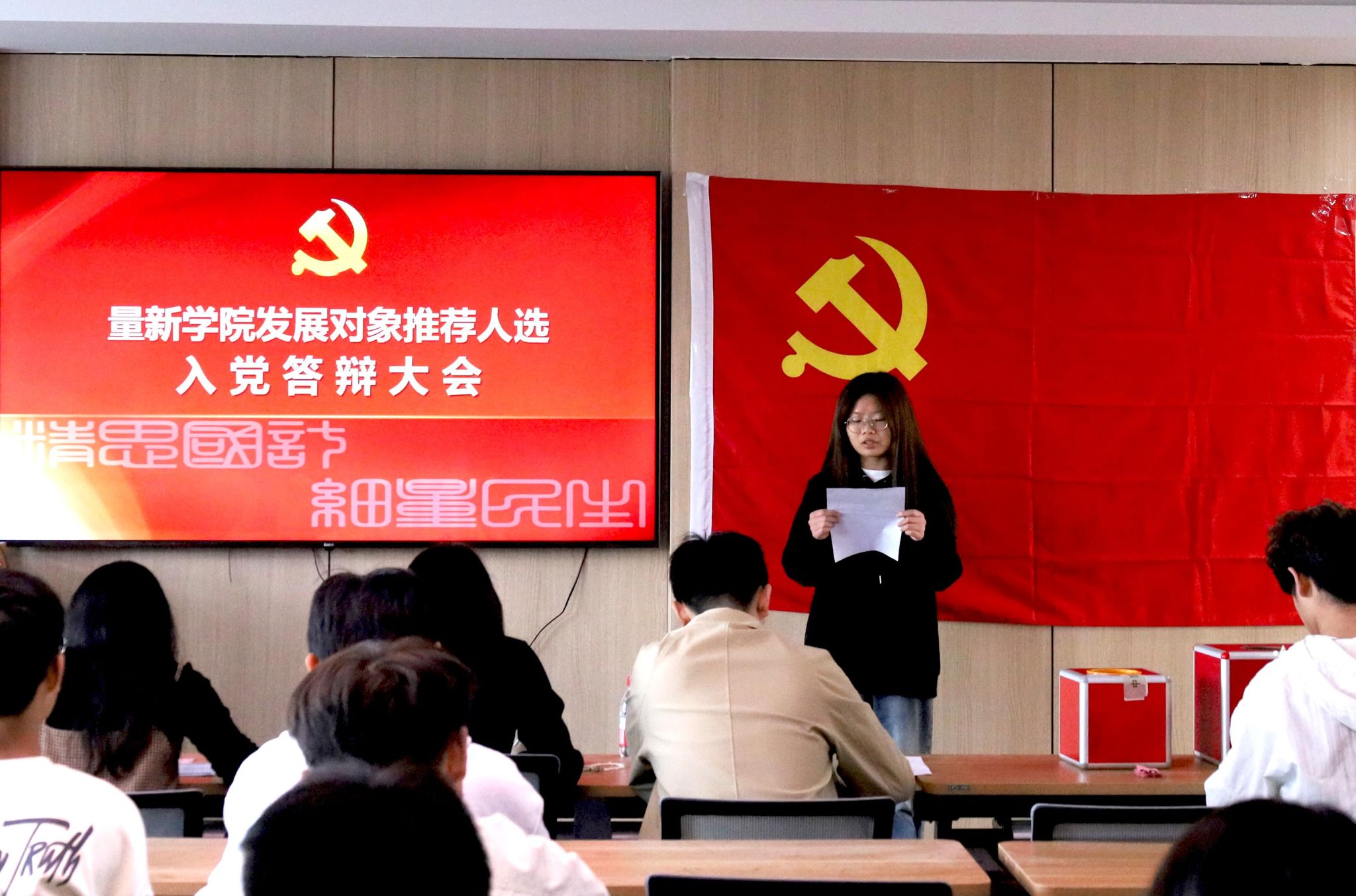 根据量新学院发展党员补充细则,经基层团支部推优产生的发展对象推荐人选需参加由学院组织的公开答辩。答辩设置了入党志愿陈述、理论知识问答、情境案例分析三个环节,现场抽取题目作答。通过答辩的形式,引导发展对象在广大师生面前亮身份、比成果、做表率,并检验其在生活化场景中的价值取向和党性认识。