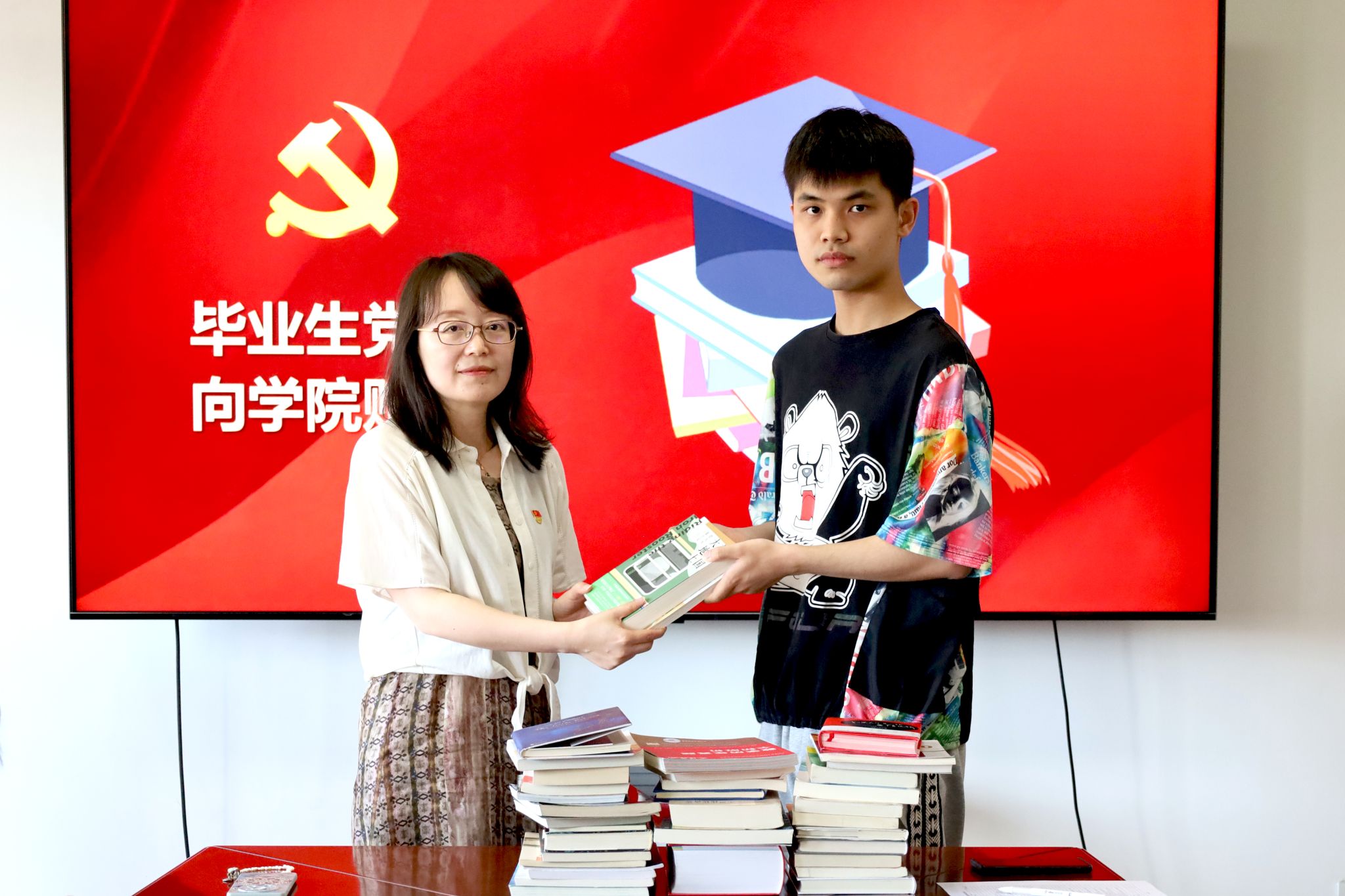 毕业生王旭辰、耿育斌等代表各学生党支部向学院赠送书籍。党员们在书籍扉页上亲笔书写了励志语录,以纸间传递的方式表达对学弟学妹的关爱和鼓励。