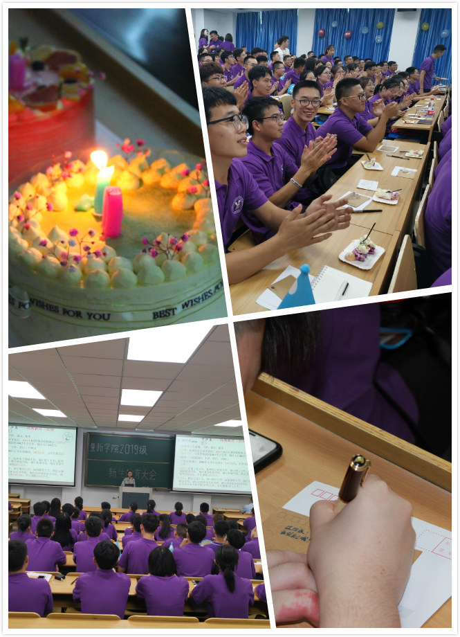 与此同时,在翔宇205教室,学生会的同学们正在紧张有序的为新生们准备“惊喜”。下午2:30,新生们准时来到教室参加新生教育大会。在大会开始前,八名九月份生日的新生被点名小程序“抽选”出参与暖场游戏,在游戏结束以为要接受奖惩的时刻,突然灯光暗下,音乐响起,生日蛋糕被缓缓推入,全场欢声四起。这不仅是八名新生的生日,也是在场所有人的入学生日,更是提前为祖国70华诞庆生,惊喜、感动的情绪感染着现场每一个人。