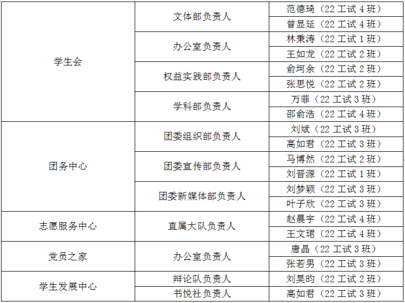 为深入学习贯彻习近平新时代中国特色社会主义思想,贯彻落实习近平总书记关于青年工作的重要论述,贯彻落实共青团中央、教育部、全国学联印发的《关于推动高校学生会(研究生会)深化改革的若干意见的通知》(中青联发〔2019〕9号)精神,根据我院学生会及其它团学组织改革相关要求,学院已于前期开展2023-2024学年院学生会及其他院级团学组织工作人员公开竞聘工作。竞聘坚持“公开、公平、公正、竞争、择优”的原则,经过自主报名、资格审核、面试等选拔程序,经综合评定,现对拟聘任工作人员名单在全院范围内予以公示,具体名单如下(排名不分先后):