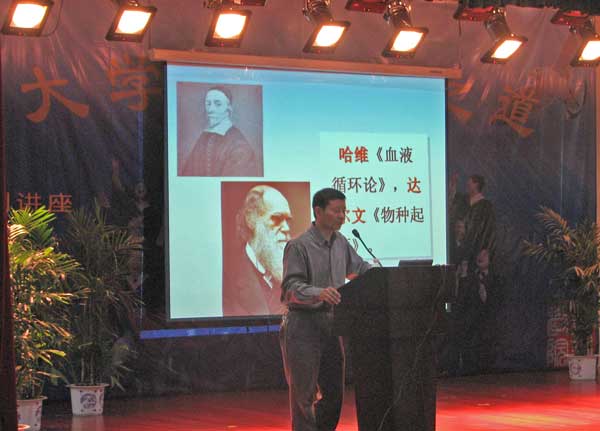 讲座中,林校长从历史的维度介绍了大学的创建过程;从功用的维度叙述了大学如何在科学发展和社会进步中发挥作用;从传统的维度阐述了大学的内涵和定义;从受众的维度对同学们提出了要求和希望。他告诉同学们:“大学之道,在明明德,在亲民,在止于至善”。真正大学之道,在于同学们能否明白那颗晶莹透明的真心,在于能否用真心去对待身边每一个生命,在于能否到达本性纯洁的至善境界。要怀着革新民心,弃旧图新,去恶从善、德性尽善尽美的追求去求学。他通过列举数学家华罗庚勤奋自学成才,马克思《资本论》、达尔文《物种起源》的编撰,牛顿万有引力的发明等事例,告诉同学们在知识的学习过程中要注重学习、勤奋为本、精读博览、注重积累;在知识的创新、创造过程中要洞察秋毫,唯物辩证,审时度势,推陈出新、抓住本质、敢为人先;在知识的运用过程中要从善如流、经世济民,潇洒大气。