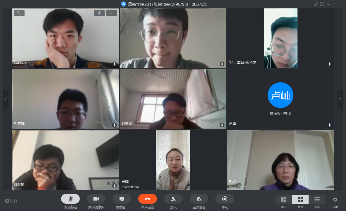 通过召开线上学生年级视频会议,使学生坚定了防疫胜利的信心,明晰了自己的学习规划和发展方向。一直以来,量新学院高度重视学风建设工作,学院将以高深造率(国内升学、出境留学)为目标,做实做细基础工作。针对2016级学生,学院也将持续开展考研复试、考研调剂等一对一个性化服务工作。在疫情期间运用好网络平台,学院创新推行系列举措,将学风建设作为学生工作的主旋律,贯穿学生培养教育过程始终。
