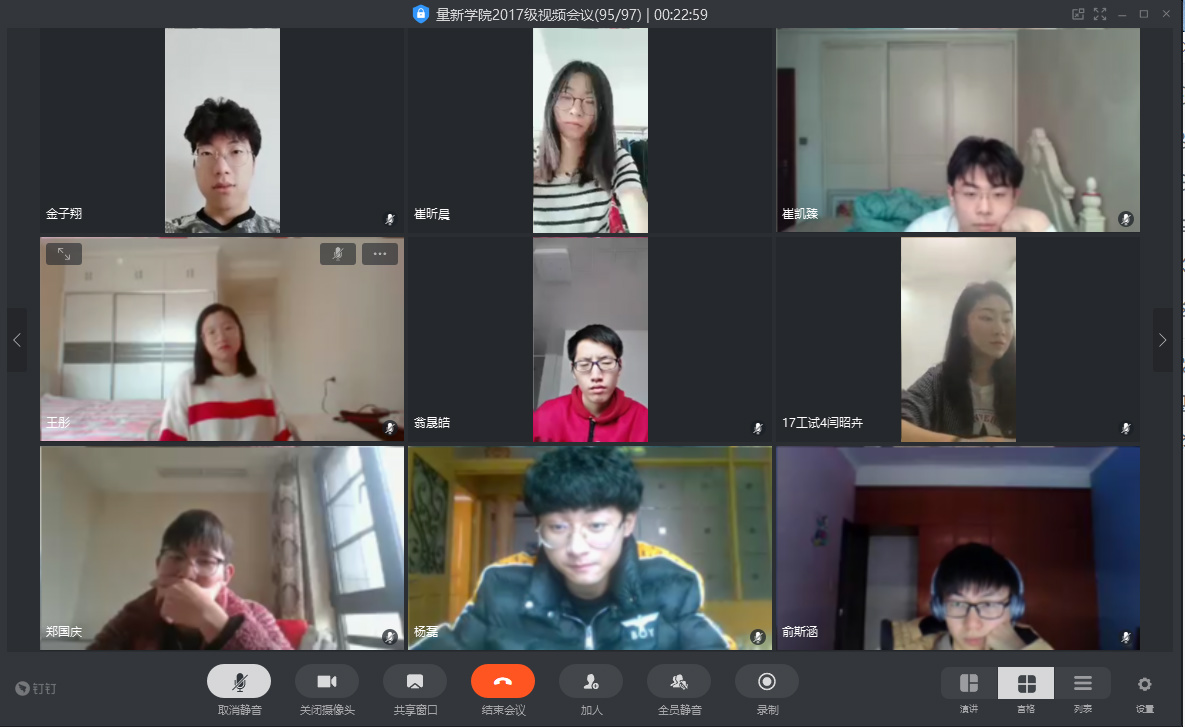 在新冠肺炎疫情防控的特殊时期,量新学院积极开展网络思想政治教育,密切关注学生思想动态,主动关心学生学习生活需要,根据学校“互联网+关怀”工作部署,在前期召开各班级线上视频班会、线上学生骨干座谈会的基础上,近日,年级辅导员于兹瀛、吴昕通过钉钉群,分别召集2017级、2018级、2019级全体学生召开了线上视频年级会。学院党总支书记杨娜、学院院长毛成参加会议,并对新学期年级工作进行了强调和部署。
