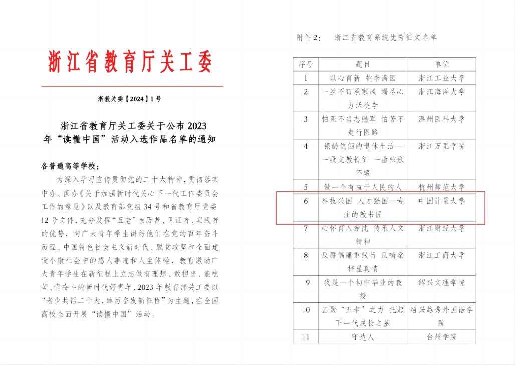 在2023年浙江省“读懂中国”活动中, 22工试2班俞坷余、李喆的征文作品获“浙江省教育系统优秀征文”。