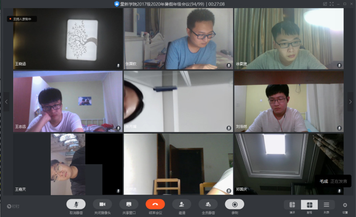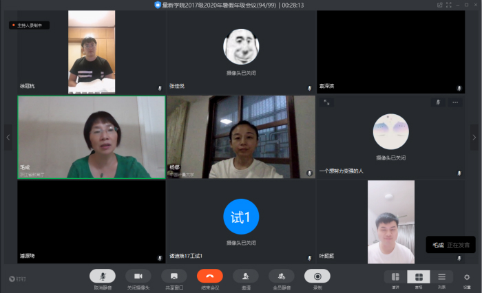 在新冠肺炎疫情防控的特殊时期,为帮助学生其更好地认清考研形势、结合自身实际合理规划和定位,8月5日,量新学院通过钉钉群,召集2017级全体学生召开了线上考研分析指导视频年级会,学院院长毛成、党总支书记杨娜、年级辅导员于兹瀛和2017级全体同学参加。