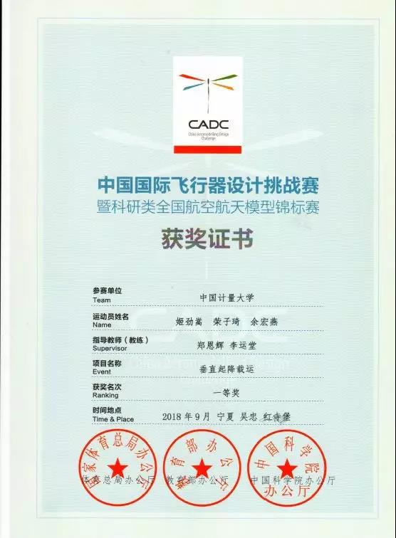 16工试2班姜佰训、16工试3班姬劲嵩、17工试4班邹庆林、吴斌获得2018年大学生科研类航空航天模型锦标赛全国一等奖。