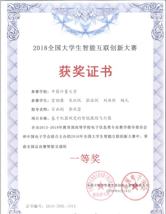 15工试1班徐冠宇、17工试1班刘浩然、及欣悦、张佳悦获得2018年大学生智能互联创新大赛全国总决赛一等奖。