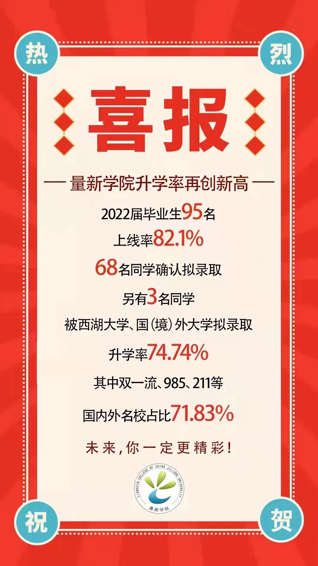 全班23人全部选择考研或出国留学,最终17人被国内高校拟录取,2人被国外高校拟录取,升学率达82.6%,其中考上双一流、985、211高校,占比78.95%,考研平均分358分。近日,量新学院18工试3班陆续传来了同学们的升学好消息,班主任周杭霞老师也为他们感到高兴。四年时光流转,在周杭霞的眼里,这是一个充满活力的班级,也是一个名副其实的“学霸班”。