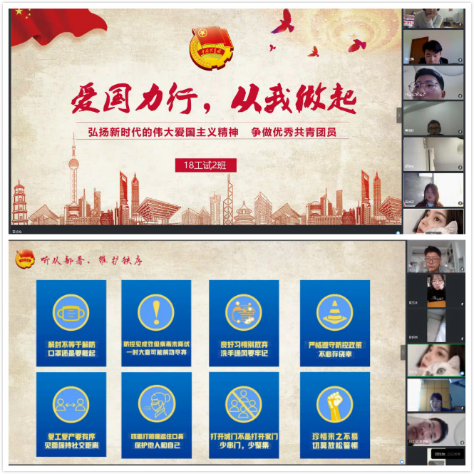 各支部借助钉钉直播、视频会议等形式大力弘扬新时代爱国主义精神,通过观看抗疫英雄纪录片、学习习近平总书记考察浙江时的重要讲话、讲述身边榜样、总结居家学习计划进度及科研备赛情况等环节,切实引导团员青年感悟和思考如何将自身的命运同国家的发展相结合。18工试4班等团支部共同录制了歌曲《明天会更好》,改编了《爱是桥梁》进行线上诗歌朗诵等,展现了朝气蓬勃的青春风采。