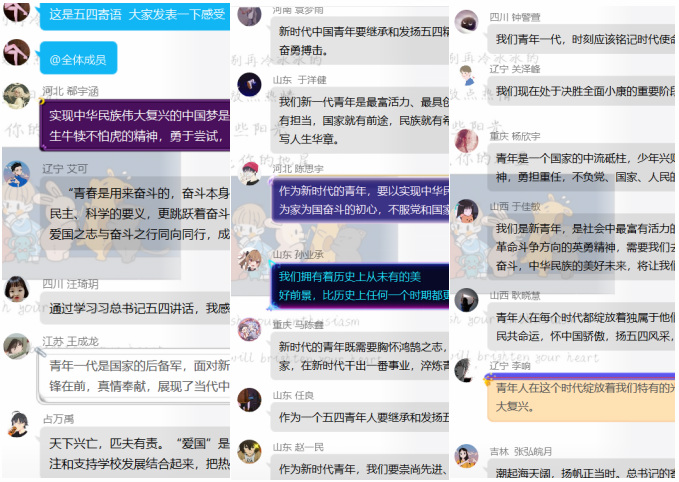 结合五四青年节的契机,各支部重温入团誓词,感悟五四精神,组织团员青年学习习近平总书记五四寄语,以视频会议连麦实时交流、寝室为单位小组讨论等多种方式围绕返校复学后团员青年如何发挥模范表率作用进行交流探索,切实将总书记对青年的期望转化为实实在在的行动,促进团员勇担使命、勠力复兴。同时,为了挖掘典型、宣传先进,各支部积极开展“五四”系列优秀评选,培育学院创先争优的良好氛围。