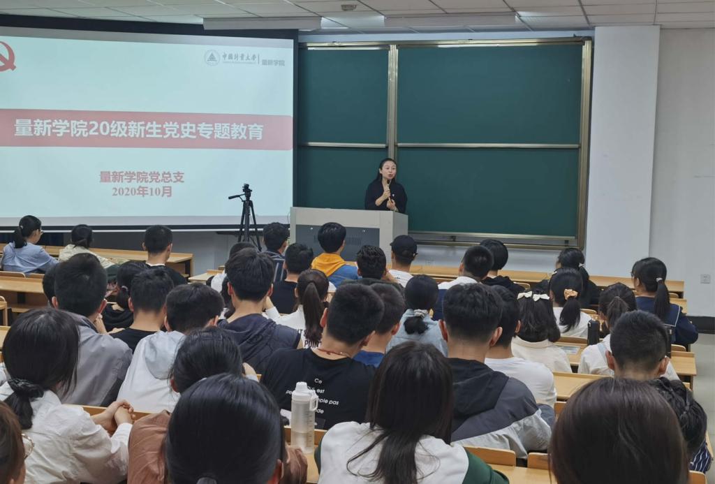 为了认真落实入学入职“第一课制度”的通知要求,提高2020级新生爱党爱国思想觉悟,作为学院新生入学教育系列活动之一,量新学院于10月9日晚在翔宇楼303教室开展党史学习教育,学院党总支书记杨娜为2020级新生上了大学入校后的第一堂党课。