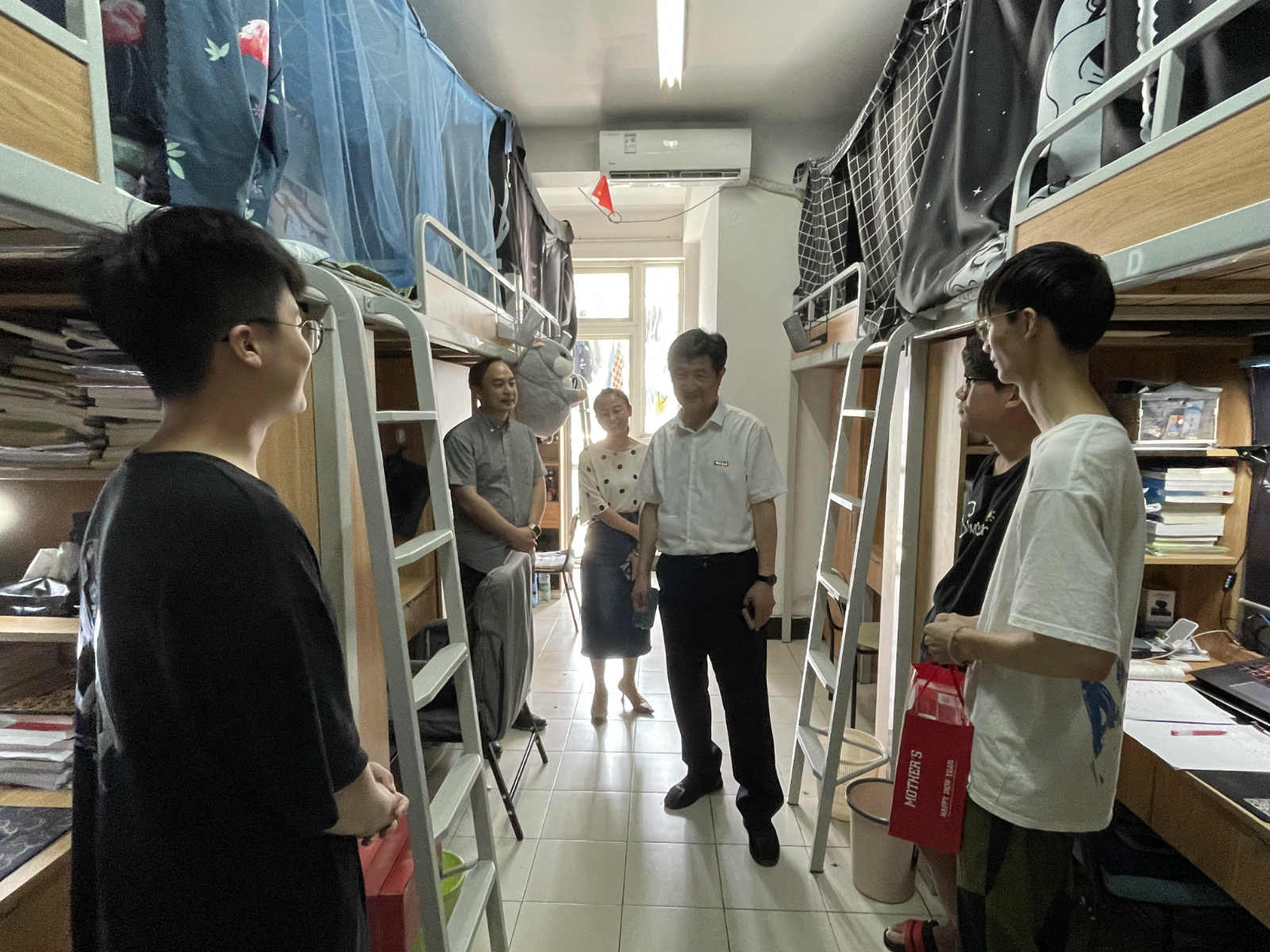 宋明顺向同学们送去了慰问品,亲切询问他们的学习生活情况。当得知寝室全体同学暑期留校开展课外竞赛活动时,他感到非常欣慰,向同学们讲述了“好好学习、天天向上”的典故,并以这句话勉励大家在扎实学习专业知识的同时也要灵活运用,努力提升综合素质,加强体育锻炼,做德智体美劳全面发展的大学生。