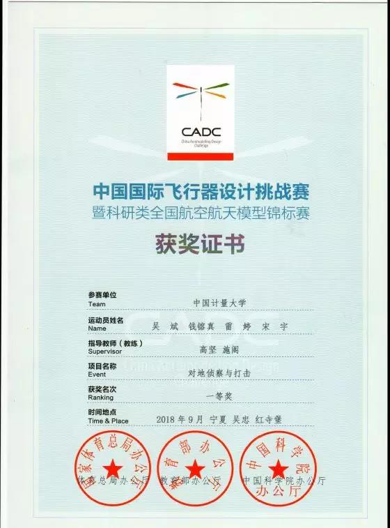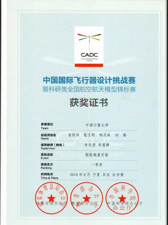 16工试2班姜佰训、16工试3班姬劲嵩、17工试4班邹庆林、吴斌获得2018年大学生科研类航空航天模型锦标赛全国一等奖。