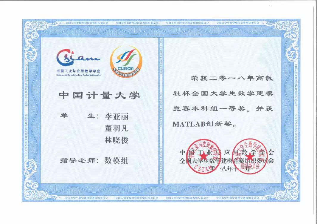 16工试3班李亚丽、董羽凡获得2018年大学生数学建模竞赛本科组全国唯一的Matlab创新奖。