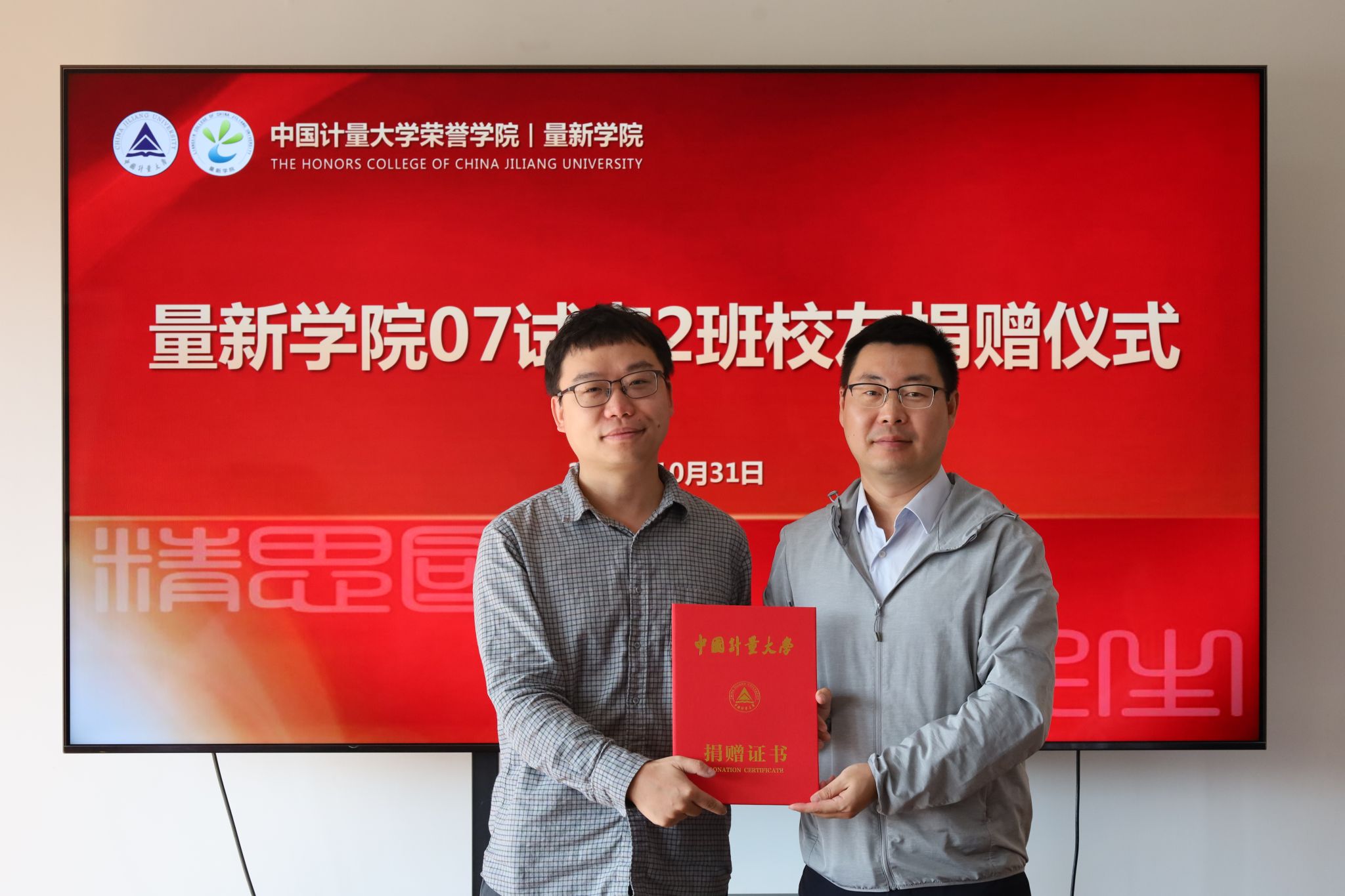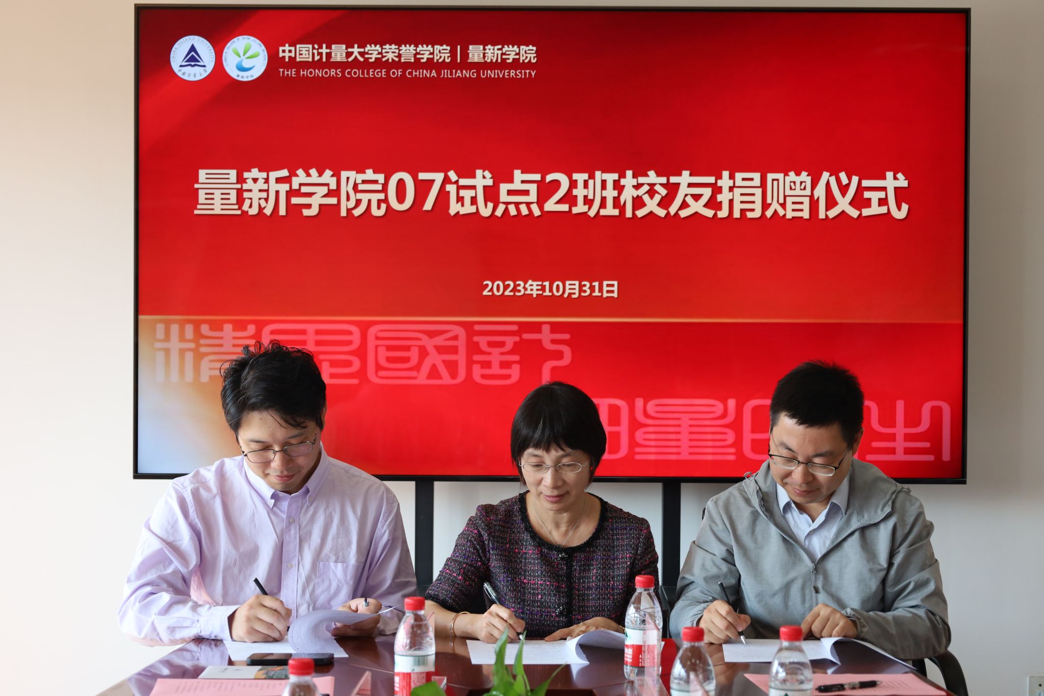 仪式上,07试点2班校友向量新学院“思源”助学金捐赠善款3万元,用于资助家庭困难、品学兼优的荣誉本科生。李华克、李琛、毛成分别代表校友班级、浙江中国计量大学教育基金会、量新学院签订捐赠协议。何云校友代表07试点2班向量新学院赠送捐赠支票。李琛代表学校向校友班级颁发捐赠证书。